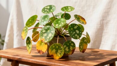 Outre le flétrissement des pointes, le dragonnier peut développer des taches brunes sur ses feuilles. Ces marques circulaires, souvent auréolées de jaune, signalent généralement une infection fongique favorisée par l’excès d’humidité. Un phénomène similaire affecte parfois les taches brunes sur votre pilea dans des conditions comparables.